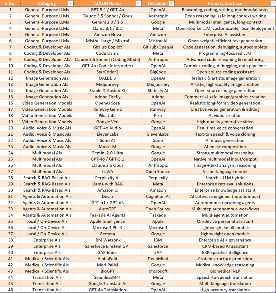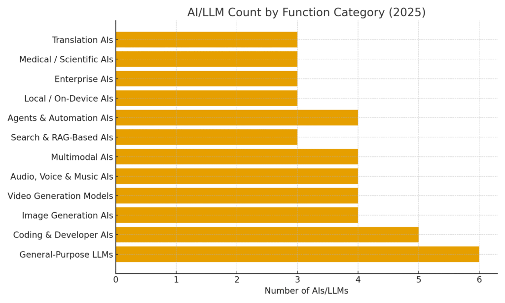 List of All AIs/LLMs Function Wise (2025 Guide) – The Complete Breakdown
